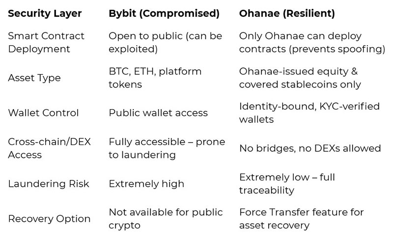 Just like corporate shares can be recovered if stolen, the same must apply to tokenized securities. The $1.4B Bybit hack exposed a systemic flaw in public blockchains: irreversibility. In contrast, Ohanae’s identity-bound wallets, lack of DEX access, and Force Transfer feature make recovery possible and theft structurally impossible. Ohanae's regulated, trust-based model sets a new standard for security in tokenized capital markets.